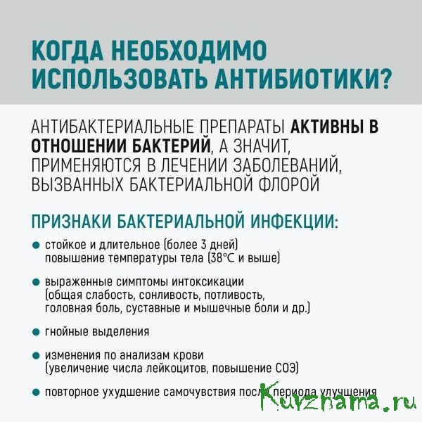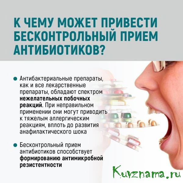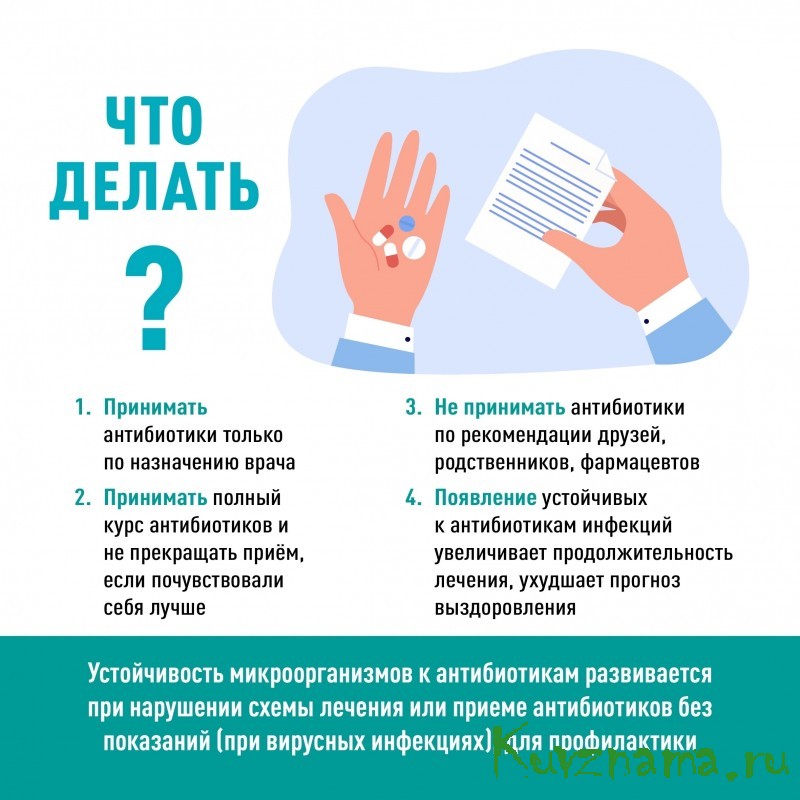 не принимайте антибиотики без назначения врача! Очень часто антибиотики начинают принимать неоправданно, в частности, при вирусных инфекциях. Однозначно заявляем: в этих случаях антибиотики неэффективны, а приводят к развитию резистентных штаммов.