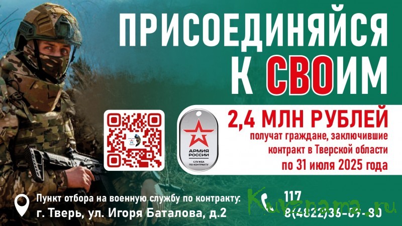 Для поступления на военную службу необходимо обращаться в военный комиссариат по месту жительства или пункт отбора на военную службу по контракту по Тверской области по адресу: г. Тверь, ул. Игоря Баталова, д. 2. Телефоны: 8(4822) 36-09-80 или 8-962-240-87-14.